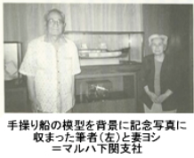 二〇〇三年(平成十五年)七月、私は五十七年ぶりに山口下関市を家内のヨシと一緒に訪れた。大洋漁業の看板は既になく、マルハ下関支社を訪れたが、懐かしい海の香りに昔を偲んだ。支社長室で大洋漁業の歴代社長の銅像を見学したり、魚のセリ市場を見て回ったり、社員食堂で食事を取ったりして楽しいひと時を過ごした。また漁港では、手繰り船を見ては、若かりしころの自分を思い出し感慨にふけたものである。旅の記念に手繰り船をカメラに収め、持ち帰ってきた。