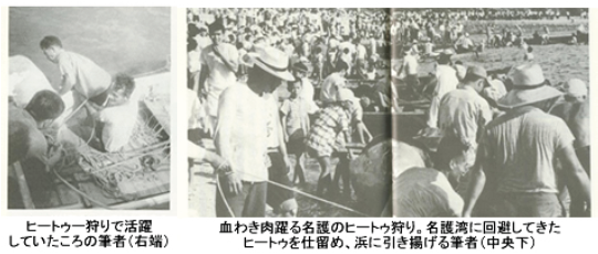 名護の町に住んでからは、漁業従事者で組を作り、船を所有した。我々は三十人で一つの組を作り、魚泉丸(七トン)を所有、名護漁港を拠点に恩納村沿岸辺りまで漁場として追い込み漁に励んだものだ。獲れたのはアカムロ、アジなどだった。漁から帰ってくるのは大体、午後三時ごろだった。