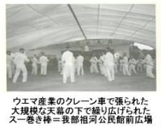 さて、二〇〇三年(平成十五年)九月六日、伝統の豊年祭が執り行われた。公民館前広場にはウエマ産業㈱のクレーン車が出動、大規模の天幕が張られ、ムードを盛り上げた。まず、十三年ぶりに復活したというスー巻き(潮巻き)棒が披露された。