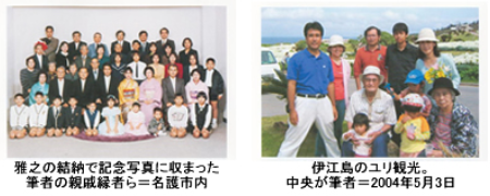 また、これは長男・雅之のことだが、雅之は名護市商工会青年部の部長時代、沖縄サミットの成功に向け、持ち前の企画力と行動力をもってサミットに協力した。このため、二〇〇一年(平成十三年)五月、部長退任に際し、同市商工会(荻堂盛秀会長)から感謝状を授与されたことも付記しておきたい。