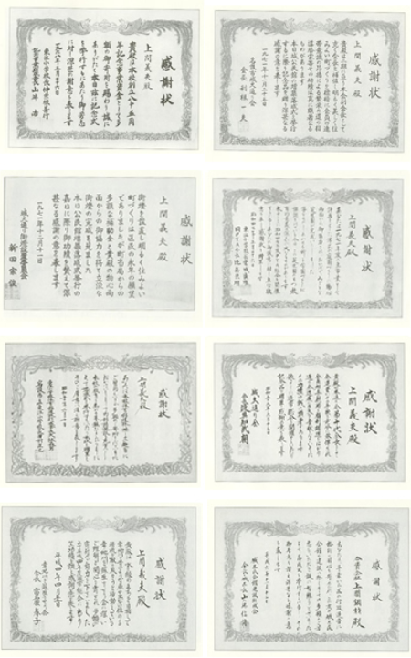 事業を興して収益を上げたならば、その一部を社会へ還元するのは事業家の務めであろう。私は社会への恩返しの気持ちで地域への貢献をささやかながらやってきたつもりである。私は、自分ができる範囲内で何件か寄付させてもらったのだ。また金には代えられない地域活動もしてきた。これらの行為を私は鼻に掛ける気持ちはさらさらないが、後進のために、幾つかの感謝状を通して、その足跡の一端をとどめておきたいと思う。